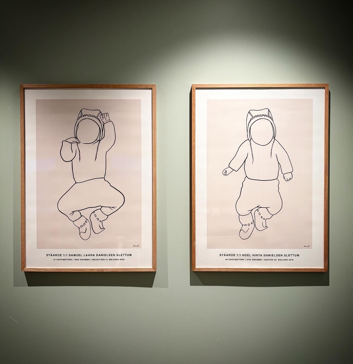 Fødselsplakat med samiske detaljer og tekst på valgfritt språk. Tegningen viser barnets faktiske lengde ved fødsel. Lue kan endres etter ønske.