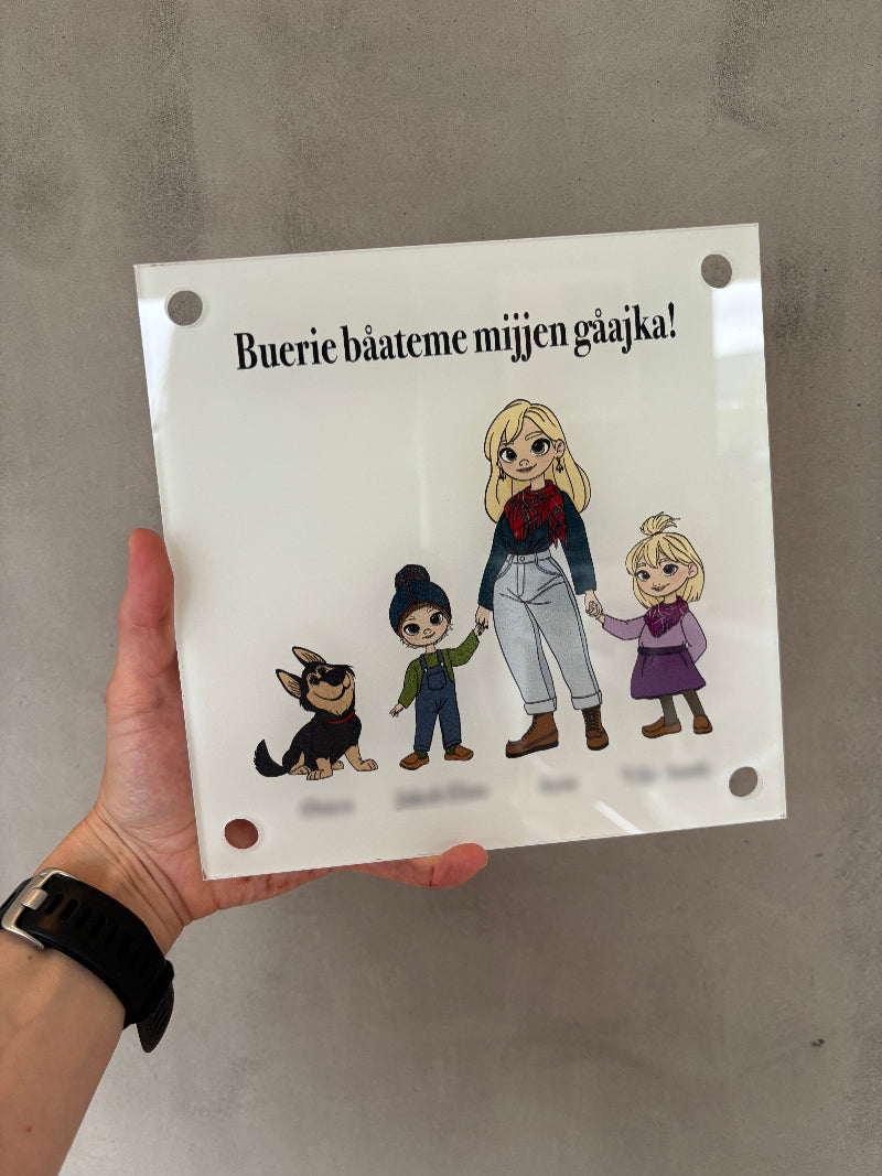 Ønsk gjester velkommen med et personlig dørskilt, med ønsket tekst, språk og bilde. Leveres som plate av plexiglass i størrelse 20x20 cm, med skruemontering.