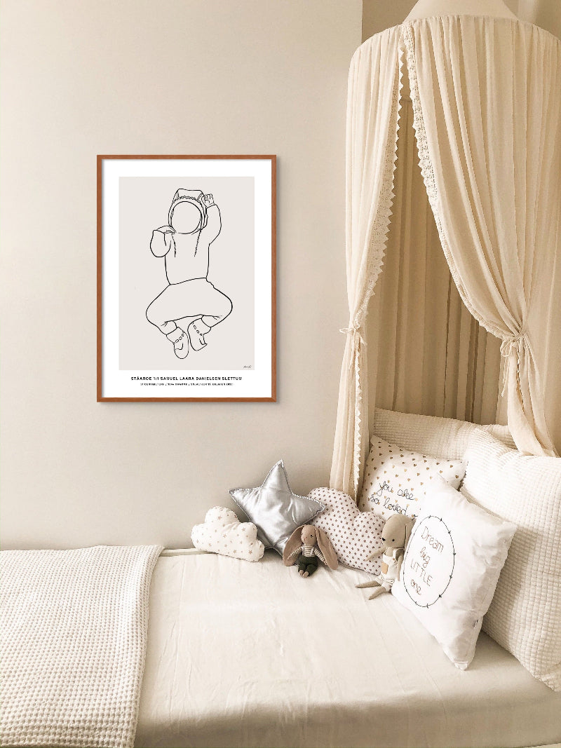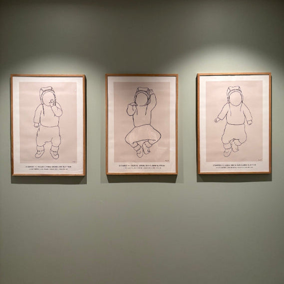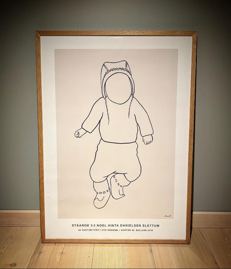 Velg mellom tre ulike motiver, alle med samiskinspirerte sokker/sko og samisk lue. Lua kan endres etter eget ønske. Tekst på sørsamisk, lulesamisk eller nordsamisk, med barnets navn, fødselsdato, vekt og lengde.