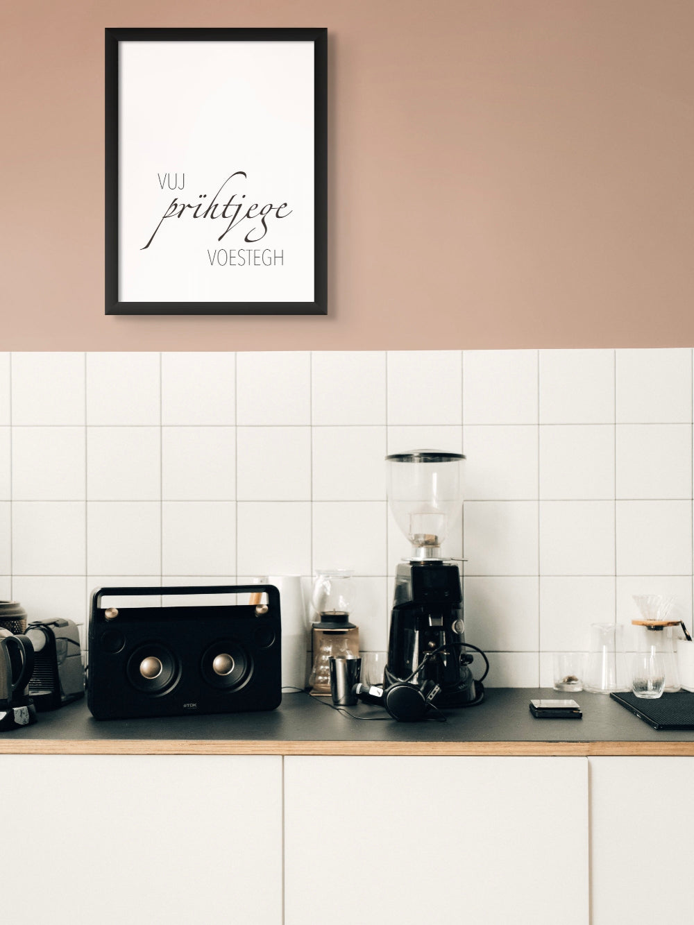Min versjon av det kjente uttrykket "But first coffee", men med det sørsamiske ordet "vuj" som kan oversetter til "kanskje".